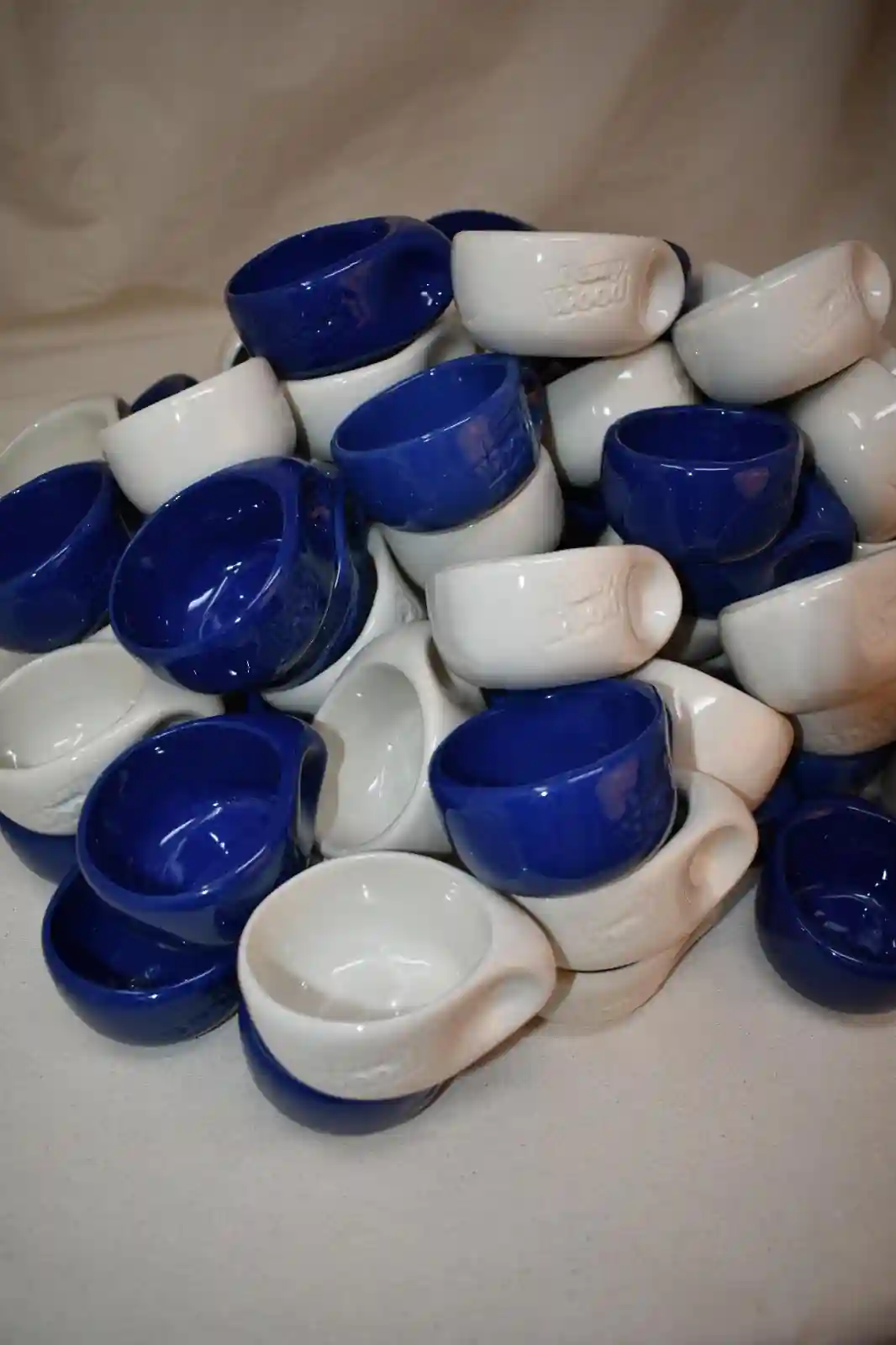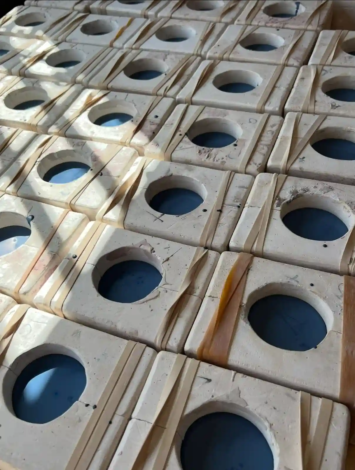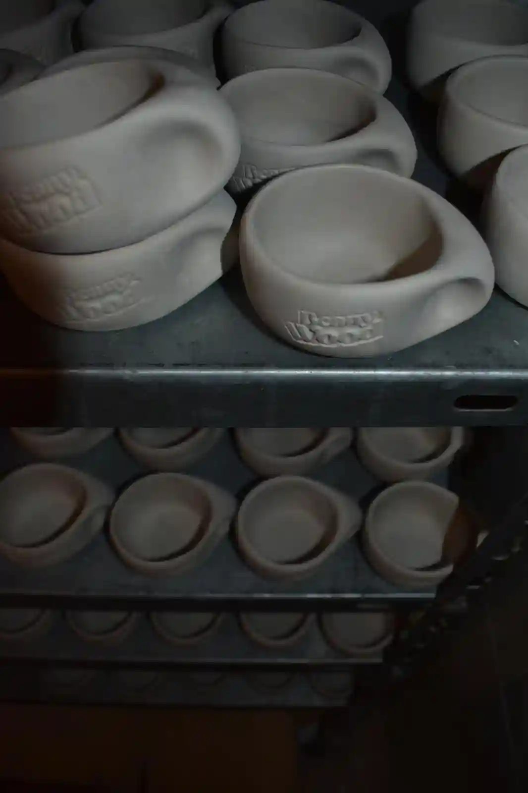 Cada pieza se elaboró mediante colada en moldes de escayola cerámica utilizando una barbotina de gres formulada para alta temperatura, desarrollada específicamente para lograr un equilibrio entre resistencia y ligereza. Tras un proceso de secado natural, las piezas se someten a una primera cocción de bizcocho a 980 °C y una segunda cocción a 1230 °C con esmalte brillante.